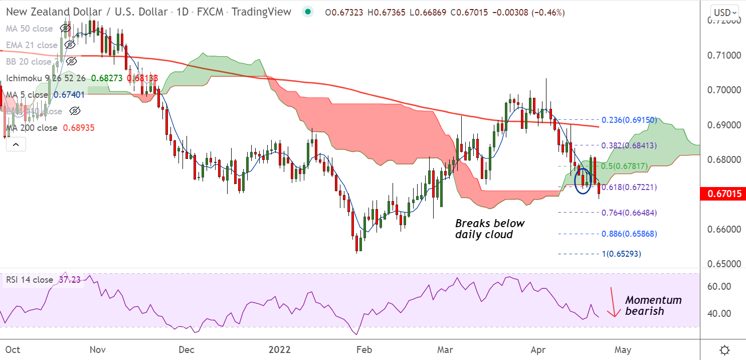 Summary: NZD/USD trades with a strong bearish bias. Scope for test of 76.4% Fib at 0.6648.