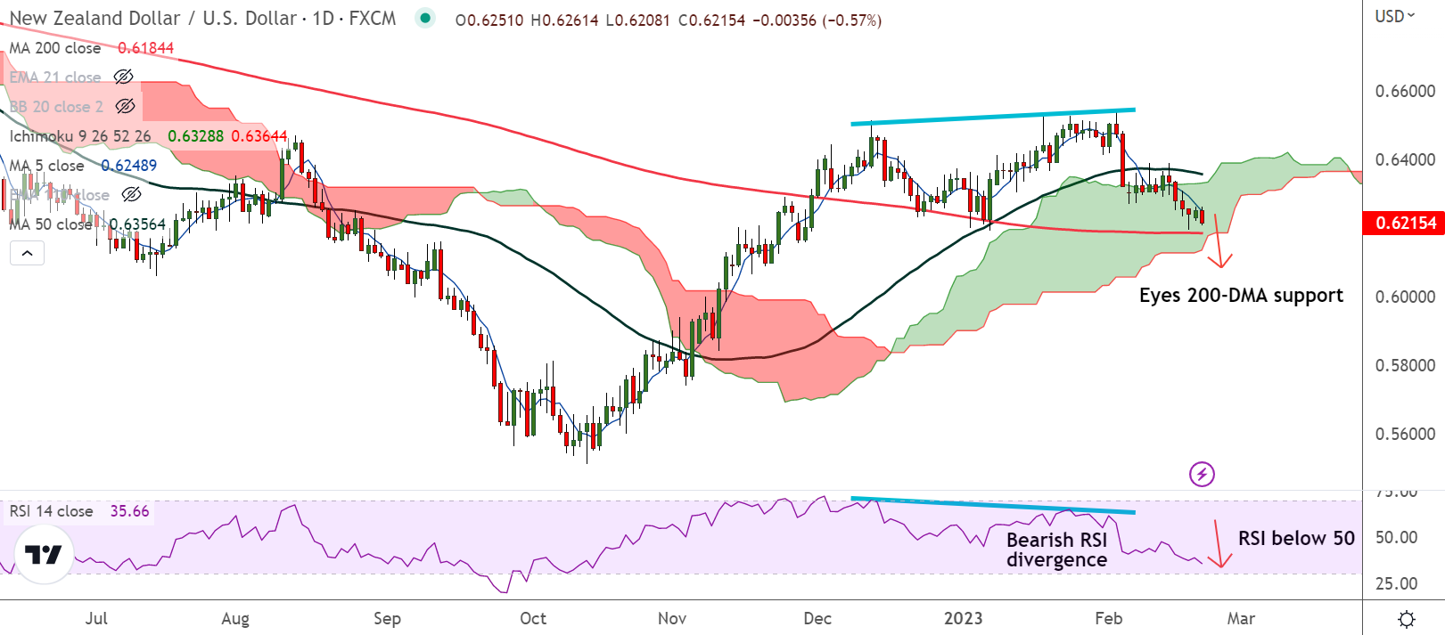 Summary: NZD/USD trades with a bearish bias. Watch for break below 200-DMA for further weakness.