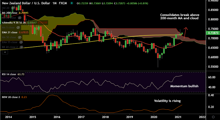 Technical studies support upside in the pair. Price action has broken above 200-month MA. Scope for test of 0.7437 (2018 high).