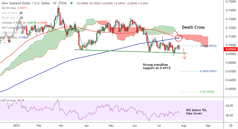 Strong supports for the pair align at 0.6953 (55-week EMA) and 0.6915 (Trendline). Break below trendline support will plummet prices further.
