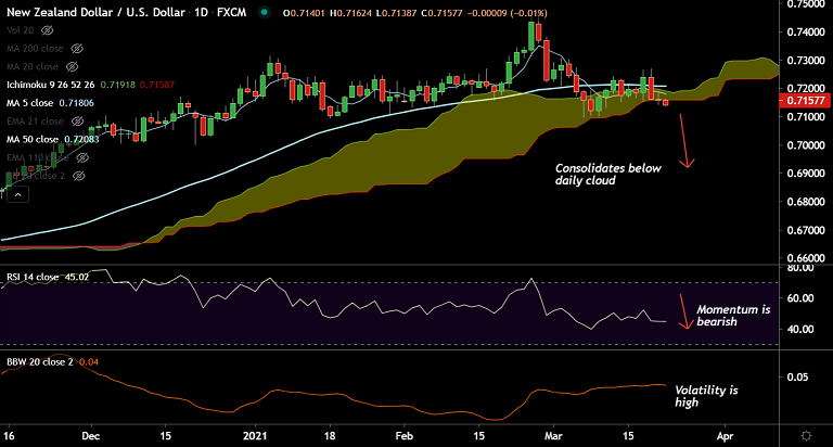 NZD/USD was trading 0.04% lower on the day at 0.7154 at around 06:15 GMT, after Doji formation on Friday's candle.