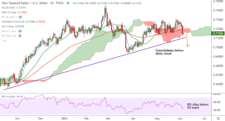 Next major support lies at 0.71 (Trendline). 55-EMA is immediate resistance at 0.7186. Retrace above cloud will change near-term dynamics.