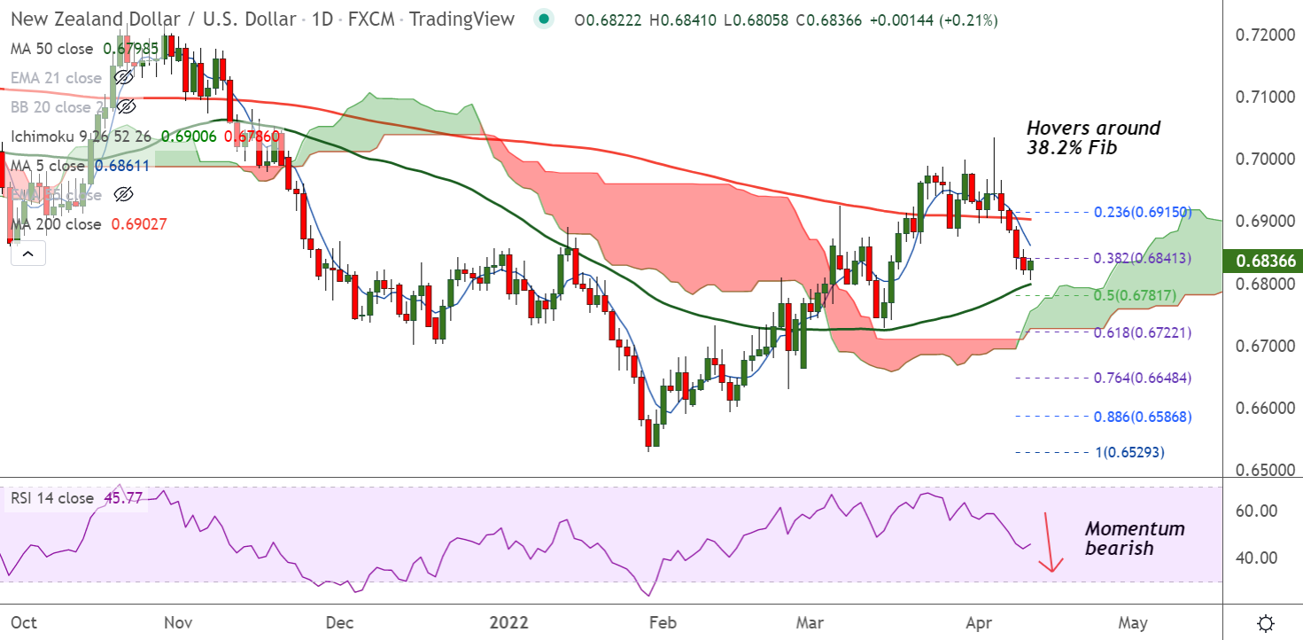 NZD/USD was trading 0.24% higher at 0.6838 at around 11:00 GMT. The pair has edged higher from 4-week lows at 0.6805, hovers around 38.2% Fib.