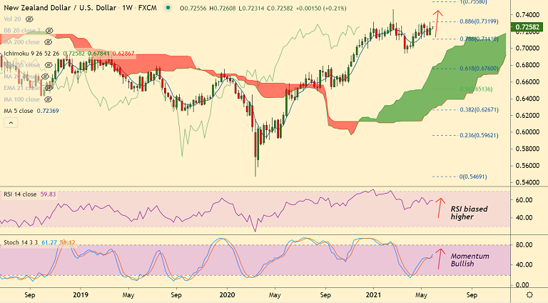 Summary: NZD/USD trades muted, but bias remains bullish. Scope for test of 88.6% Fib at 0.7320 ahead of yearly high at 0.7464. Bullish invalidation only below 200-DMA.
