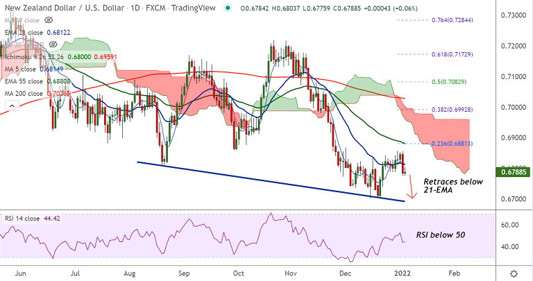 Summary: NZD/USD trades with a bearish bias. The pair is on track to test 200-week MA.