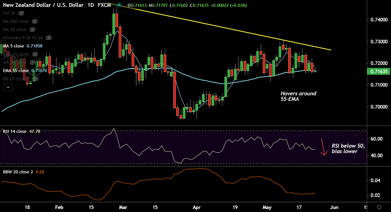 NZD/USD was trading 0.07% higher on the day at 0.7166 at around 03:35 GMT, slipping lower from session highs at 0.7179.