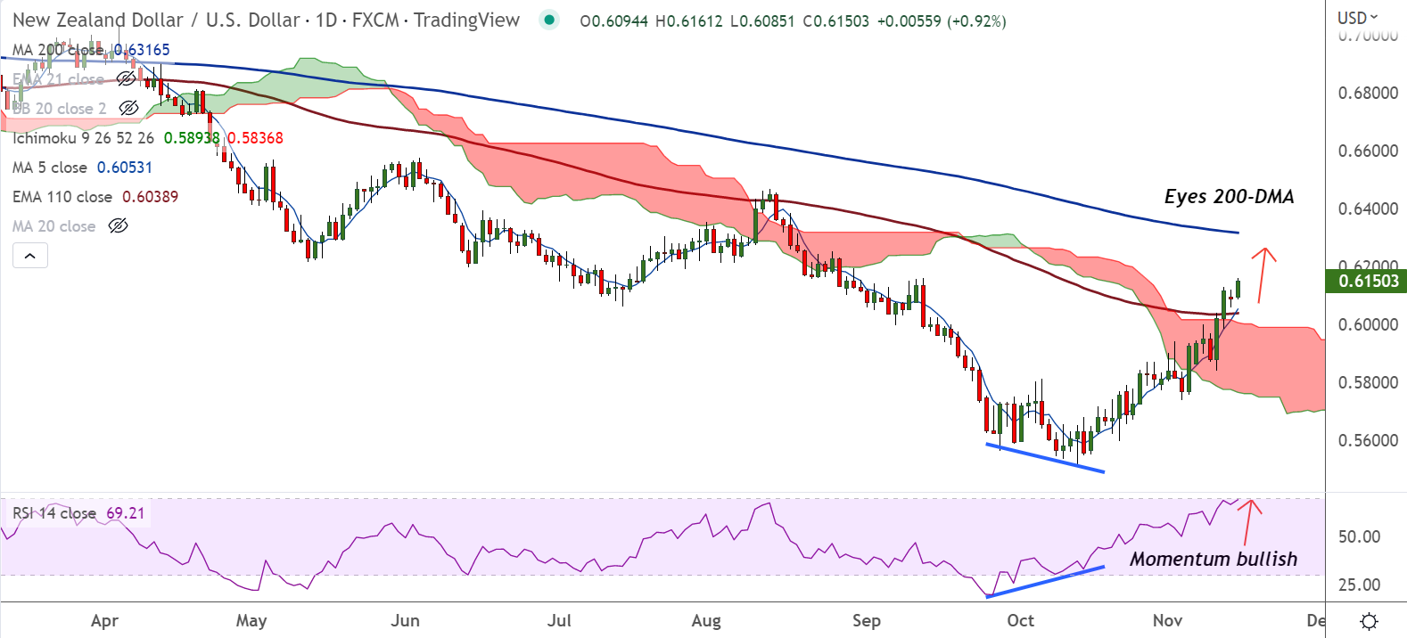 NZD/USD was trading 0.78% higher on the day at 0.6141 at around 09:50 GMT, extends gains for the 4th straight session.
