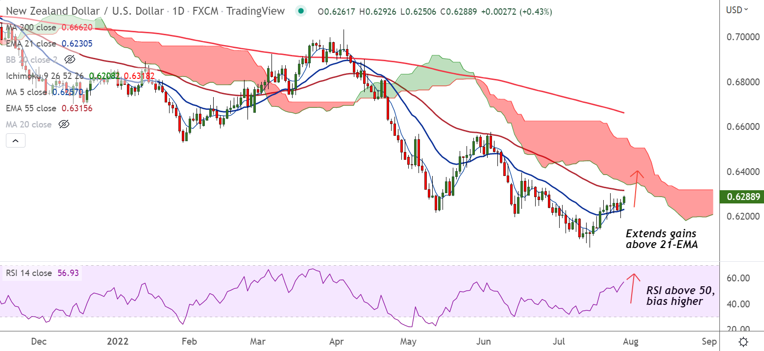 Summary: NZD/USD trades with a bullish bias. The pair eyes immediate resistance at 55-EMA, break above will see further gains.