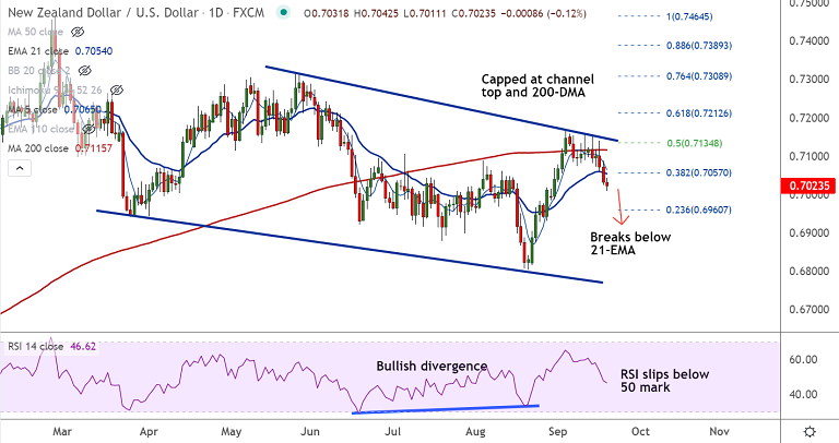 - NZD/USD extending downside after rejection at channel top and 200-DMA