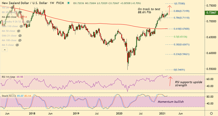 NZD/USD tracks Aussie higher to hit new 6-week highs at 0.7268, scope for further gains.