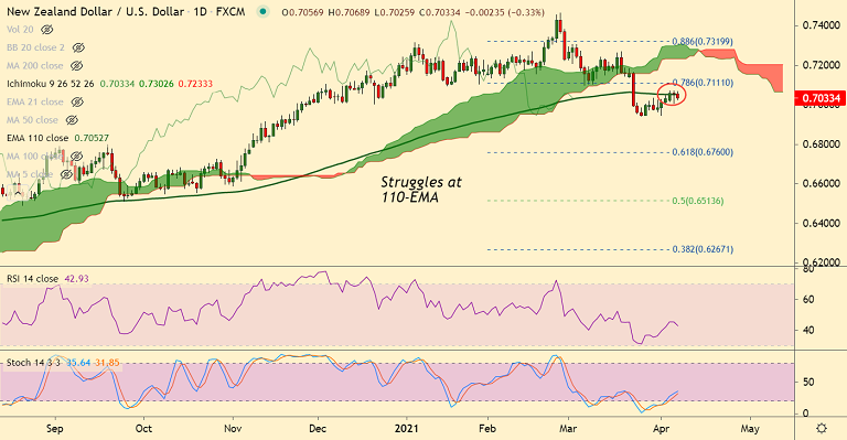 Technical bias for the pair remains neutral. The pair is extending choppy trade along 110-EMA. Stiff resistance seen till 0.7080 mark. Decisive break above will buoy upside.