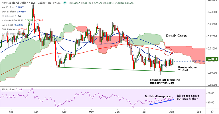 Summary: NZD/USD break above 21-EMA has raised scope for further upside. Bullish RSI divergence adds to the upside bias. That said, 'Death Cross' (bearish 50-DMA crossover on 200-DMA) could cap upside in the pair.