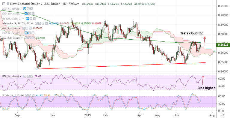 Resistance levels - 0.6710 (200-DMA), 0.6754 (Upper BB), 0.6782 (Apr 15 high)