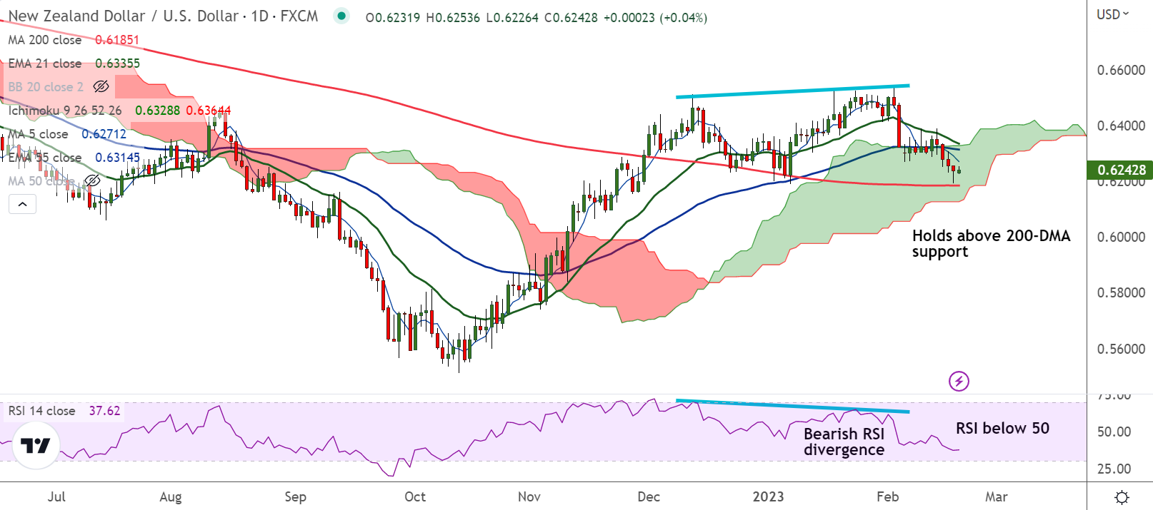 Support - 0.6185 (200-DMA), Resistance - 0.6271 (5-DMA)