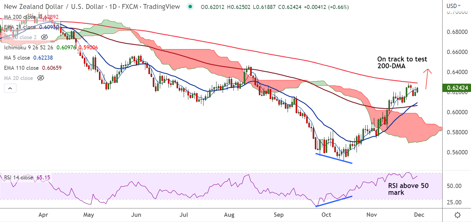 Price action is above 200H MA and GMMA indicator shows major and minor trend are bullish. The pair is on track to test 200-DMA. Decisive break above will fuel further gains.