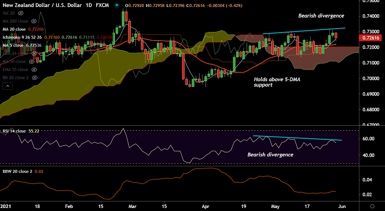 Summary: NZD/USD weighed down by a bearish RSI divergence on the daily charts. Major trend for the pair remains bullish. Pullbacks are likely to be shallow. Cloud offers strong support at 0.72 mark. Major weakness only below 200-DMA.
