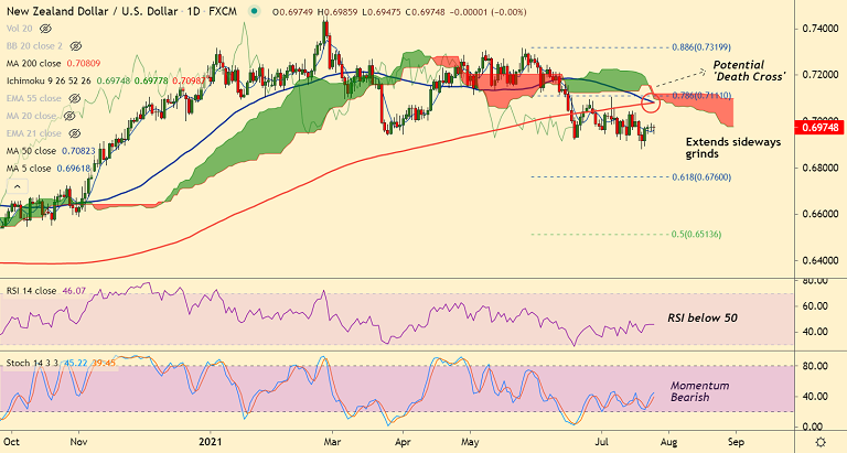 Resistance levels - 0.6993 (21-EMA), 0.70, 0.7080 (200-DMA)