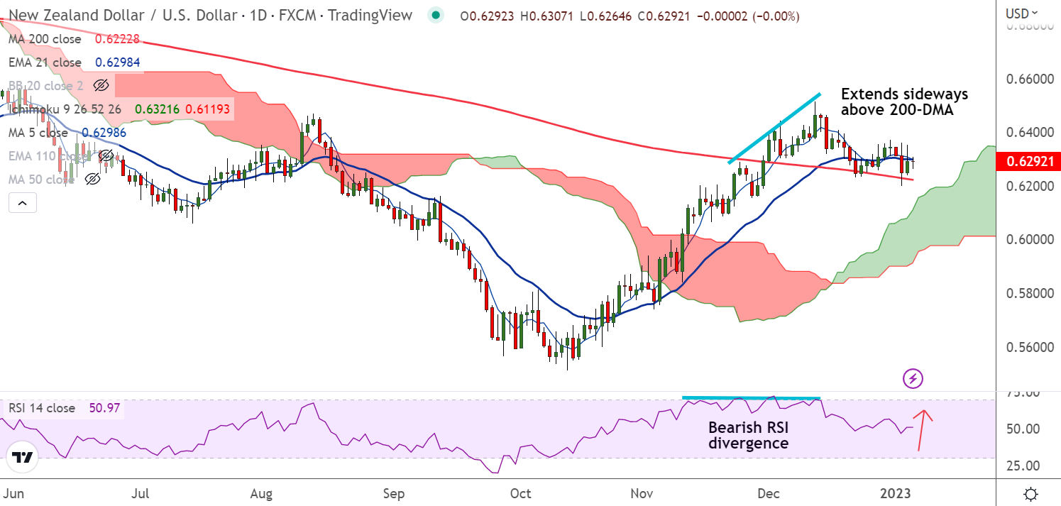 NZD/USD was trading largely unchanged at 0.6294 at around 11:45 GMT. The pair is extending sideways grind above 200-DMA, technical bias is neutral.