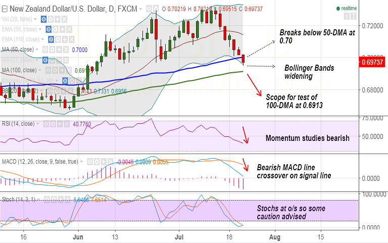 - Technically the pair has broken below 50-DMA at 0.70 and we see scope for test of 100-DMA at 0.6915.