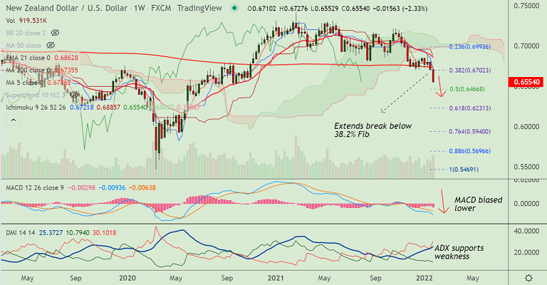 NZD/USD was trading 0.43% lower on the day at 0.6555 at around 10:00 GMT, outlook bearish.