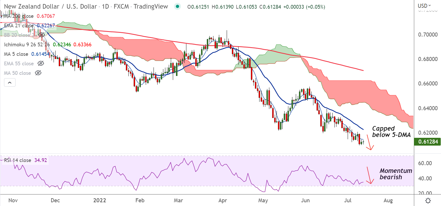 The pair has failed to benefit from the RBNZ rate hike and fades the previous day’s corrective pullback from 26-month low.