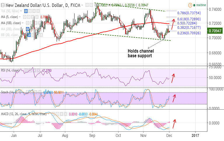 - Support levels - 0.7083 (5-DMA), 0.70, 0.6965 (channel base)