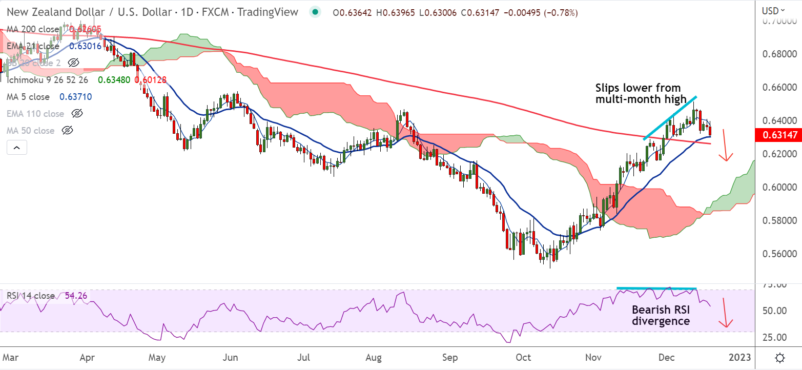 Summary: NZD/USD trades with a bearish bias. Watch out for break below 21-EMA for further weakness. Next major support lies at 200-DMA at 0.6260.