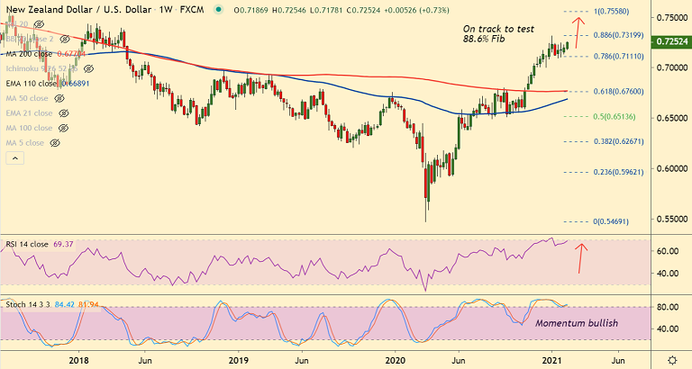 NZD/USD hits 5-week highs at 0.7254 before easing slightly. Technical indicators are are turning bullish.