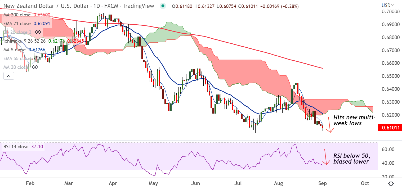 The pair has hit fresh 7-week lows below 0.61 handle, technical indicators suggest further weakness.