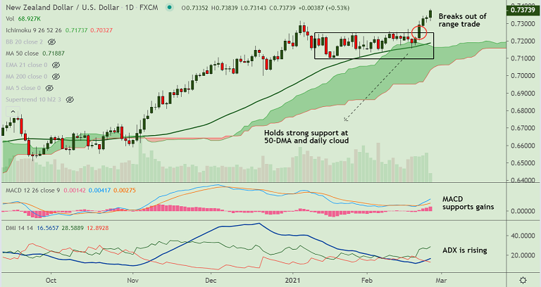 The move put a bid under the kiwi, pushing the pair higher. Price action has broken range trade on the daily charts.