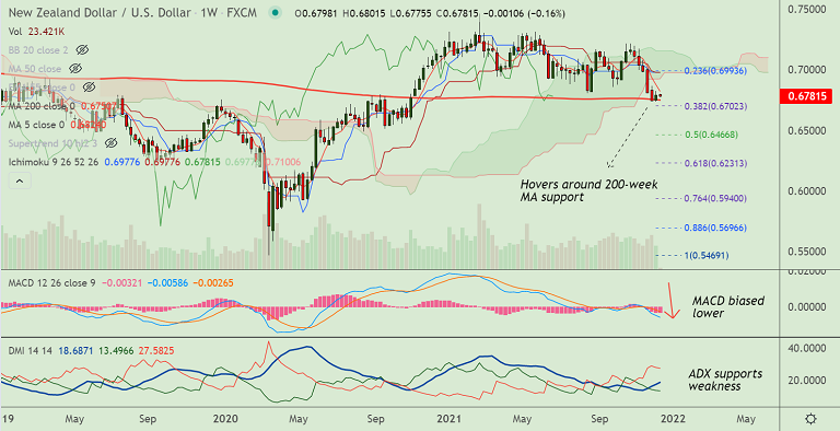 Price action hovers around 200-week MA which is major support at 0.6750. Break below will plummet prices.