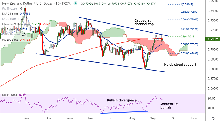 Summary: NZD/USD is trading with a bullish bias, but is struggling at some stiff resistance at 200-DMA and channel top. Decisive break above will fuel further gains. Focus on New Zealand GDP data and FOMC meet for impetus.