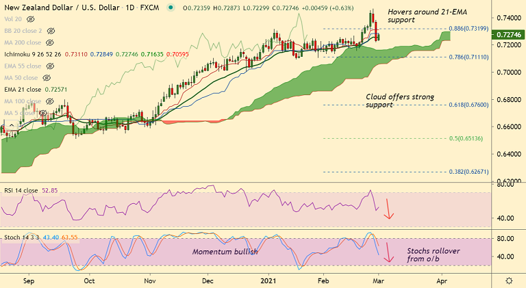 NZD/USD trades with a major bullish bias and pullback seems to find support at 21-EMA. Breach below 21-EMA support will test cloud support at 0.7163.
