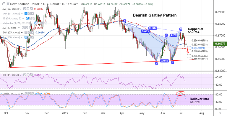 The pair grinds lower after Bearish Gartley pattern formed on the daily charts.