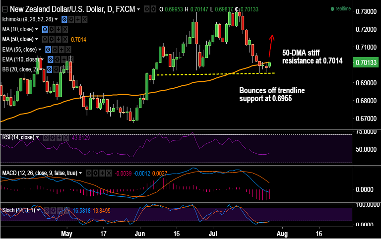 - Upside is holding above 0.70 handle, finds stiff resistance by 50-DMA at 0.7014.