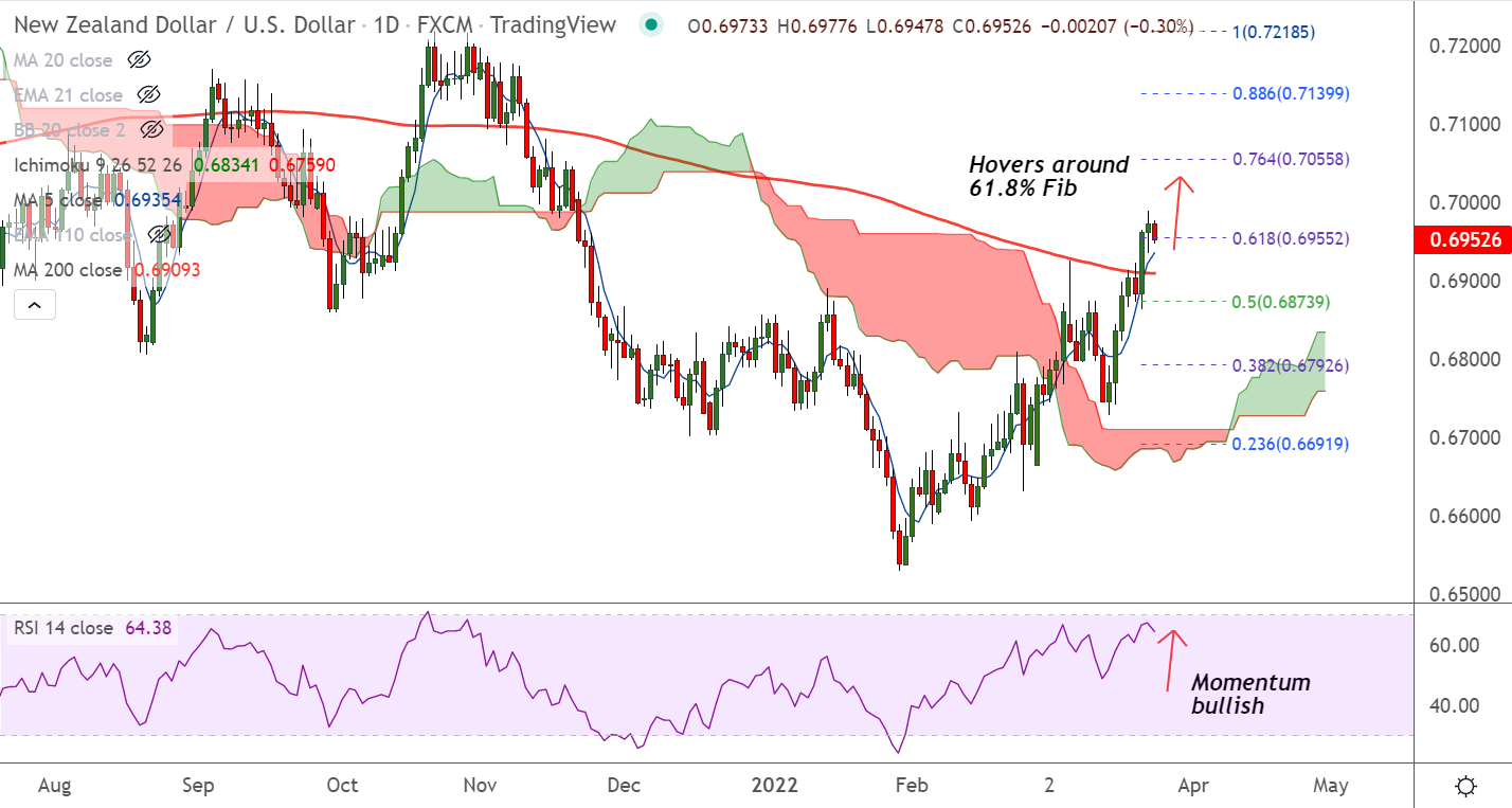 On the flipside, 200-DMA is major support at 0.6909, retrace below will dent further gains in the pair.
