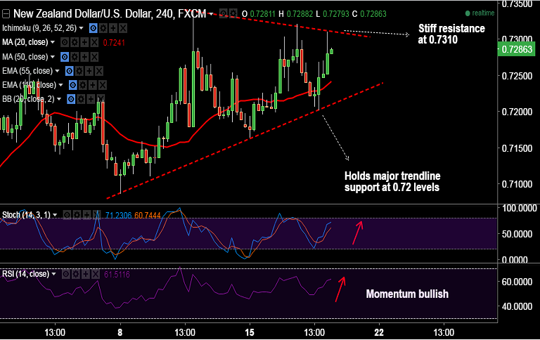 - NZD/USD intraday bias higher, finds stiff resistance at 0.7310 (falling trendline).
