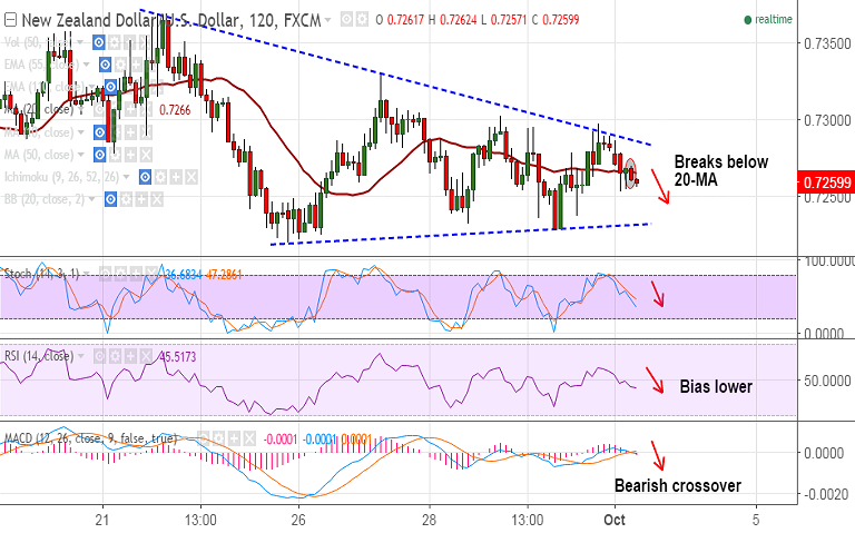 - NZD/USD breaks below 2H 20-SMA at 0.7266, bias lower. The pair finds next major trendline support at 0.7230.