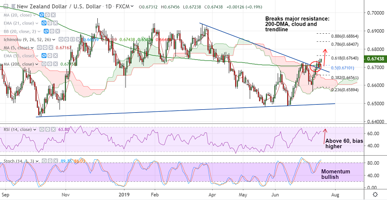Technically, 200-DMA breakout has opened up further upside for the pair. Volatility is also rising on the daily charts.