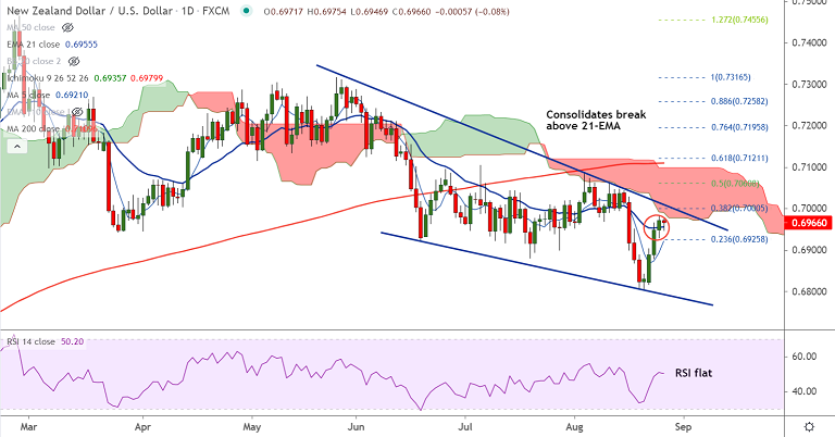 Support levels - 0.6955 (21-EMA), 0.6925 (23.6% Fib), 0.6920 (5-DMA)