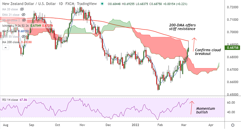 Price action finds stiff resistance at 200-DMA at 0.6928, break above will fuel further gains.