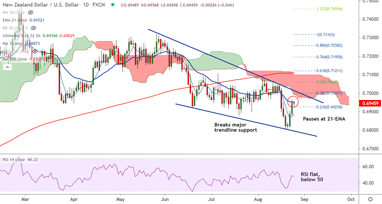 The major paused its two-day bullish streak at 21-EMA resistance, mixed New Zealand trade data was of no help.