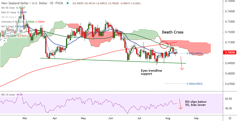 - Death Cross (bearish 50-DMA crossover on 200-DMA) on the daily charts keeps bias bearish