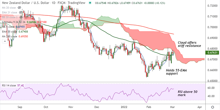 Technical bias is in favour of the bulls. The pair finds stiff resistance at daily cloud. Break above will fuel further gains.