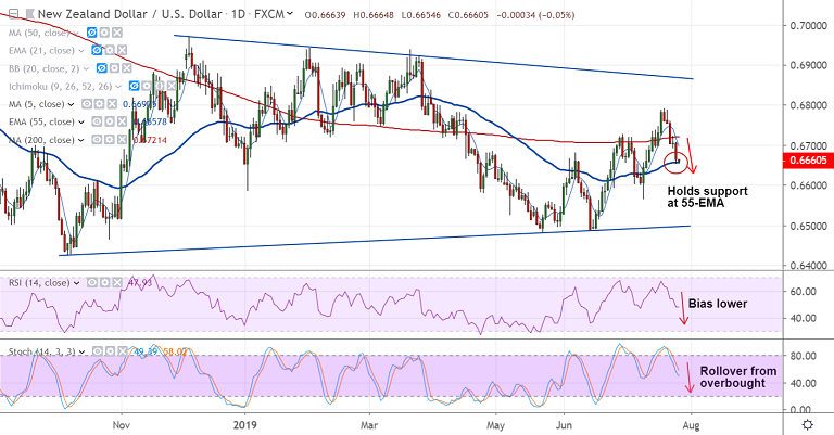 NZD/USD comatose around 55-EMA support, weakness to continue on break below.
