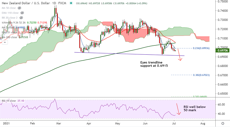 The pair is on track to test major trendline support at 0.6915. 5-DMA is immediate resistance at 0.6988. Bearish invalidation above 200-DMA.