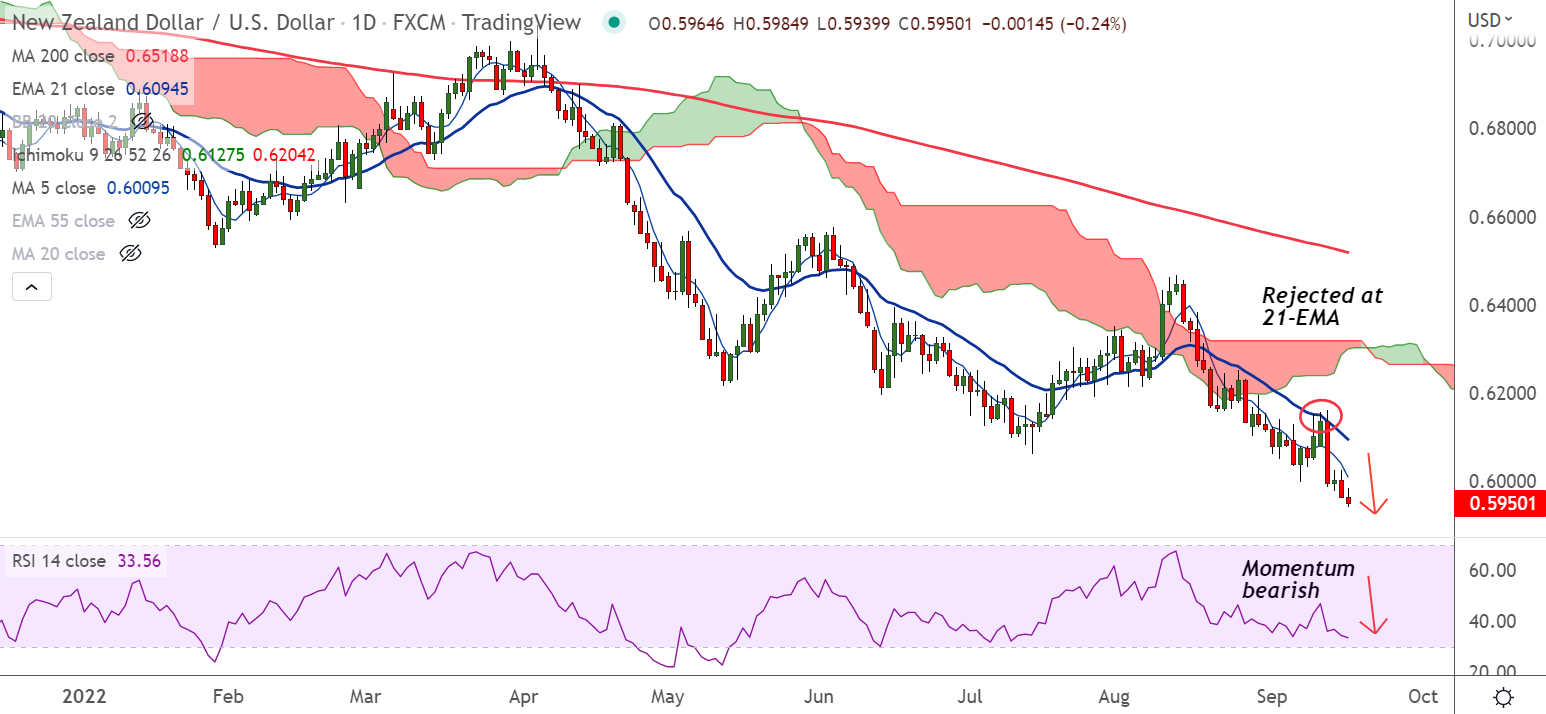 The major has refreshed 2-year lows below 0.59 handle, outlook is bearish.