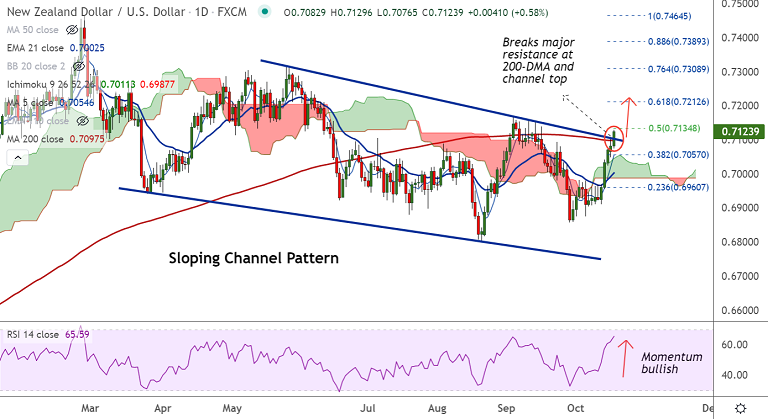 - NZD/USD has broken major resistance at 200-DMA and channel top