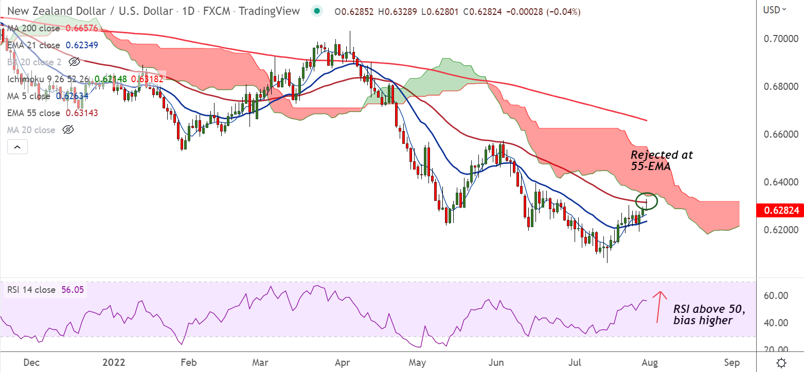 - The pair has been rejected at 55-EMA resistance at 0.6314, break above required for upside