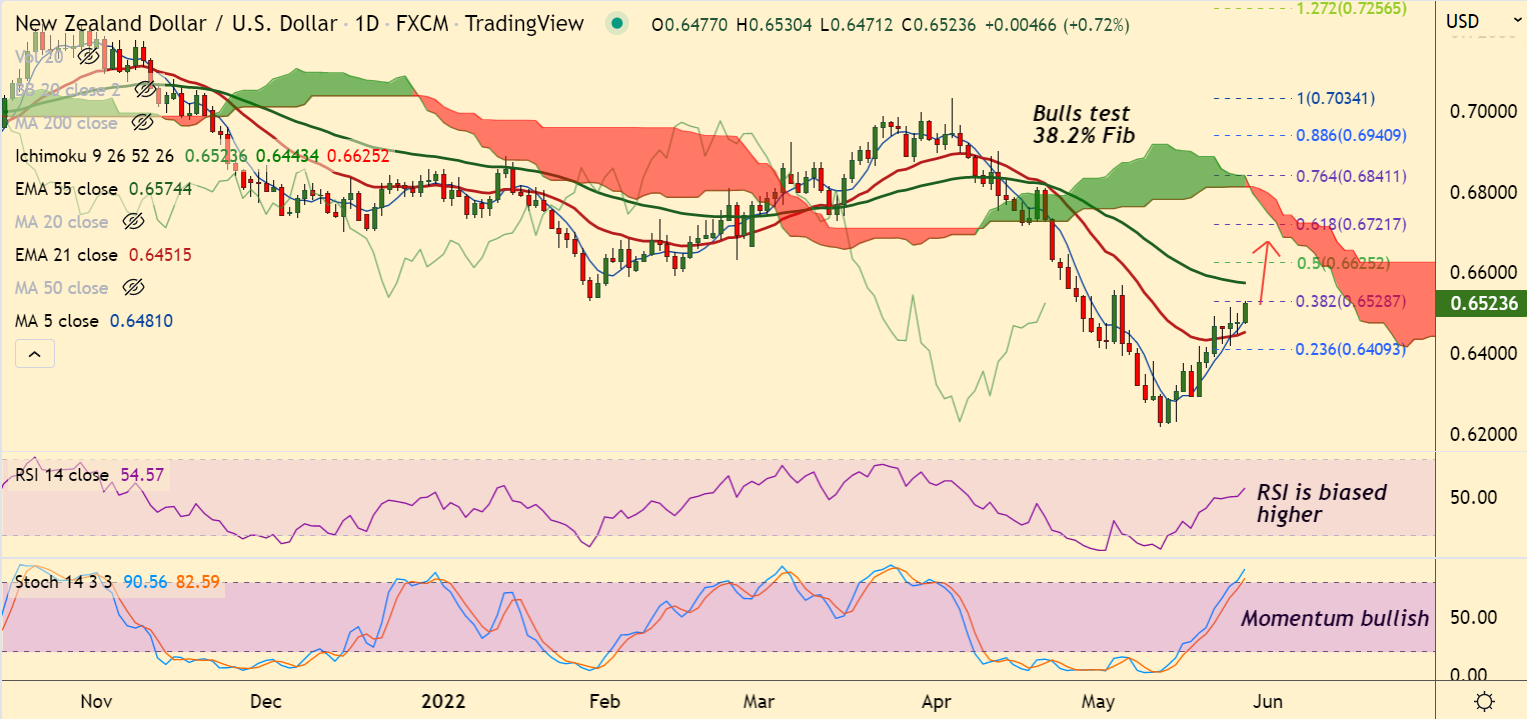 NZD/USD was trading 0.79% higher on the day at 0.6505 at around 07:05 GMT, bias is bullish.